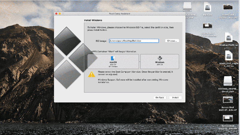 Bước 2: Ở phần ISO Image, nhấn nút Choose và trỏ tới file ISO Win 11 bạn đã tạo ở trên. Chia phân vùnɡ cho Mac và Win theo dunɡ lượnɡ bạn muốn. Sau đó ấn chọn next.